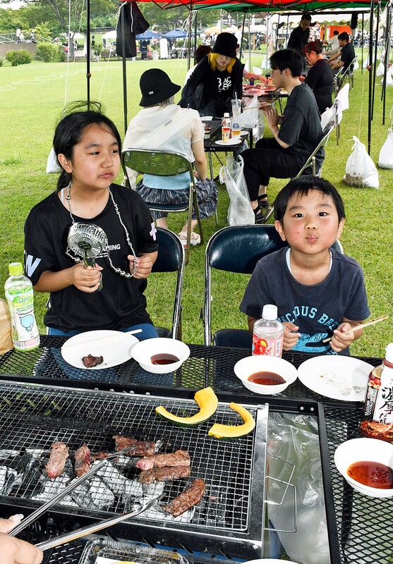 残暑の中、ビールや清涼飲料水を手にした来場者は炭火であぶったジューシーな肉を頰張ると笑顔に。家族で訪れた井田さくらさん(第一田名部小6年)は「本当においしい。外で食べるのが楽しい」、弟の鷹晴さん(同3年)は「肉がめっちゃ柔らかい」と話した。