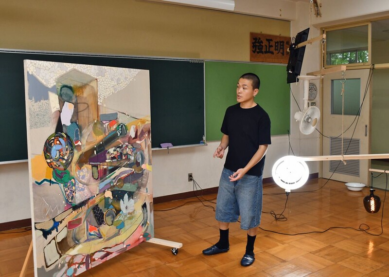 教室だった部屋や階段を巡ると、感光剤を塗った布に村人の形を写した作品、村内で感じたことを話している音声など、さまざまな表現の作品に出合える。八工大の皆川俊平准教授(43)は、天井からつるした扇風機とライトで風と光を一枚の絵画に当て、刻々と変化する自然を表現した。展示は8人の10作品でスタート。会期中に3人が制作を進め、作品は約20点になる見込み。
