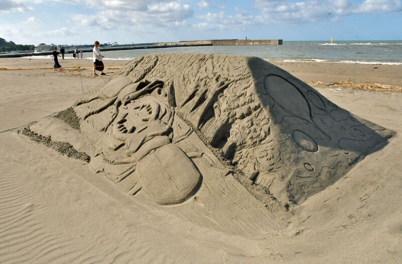 青森県鯵ケ沢町のはまなす公園近くにある鯵ケ沢海水浴場の砂浜に、今年もサンドアートがつくられ、町民や観光客を楽しませている。