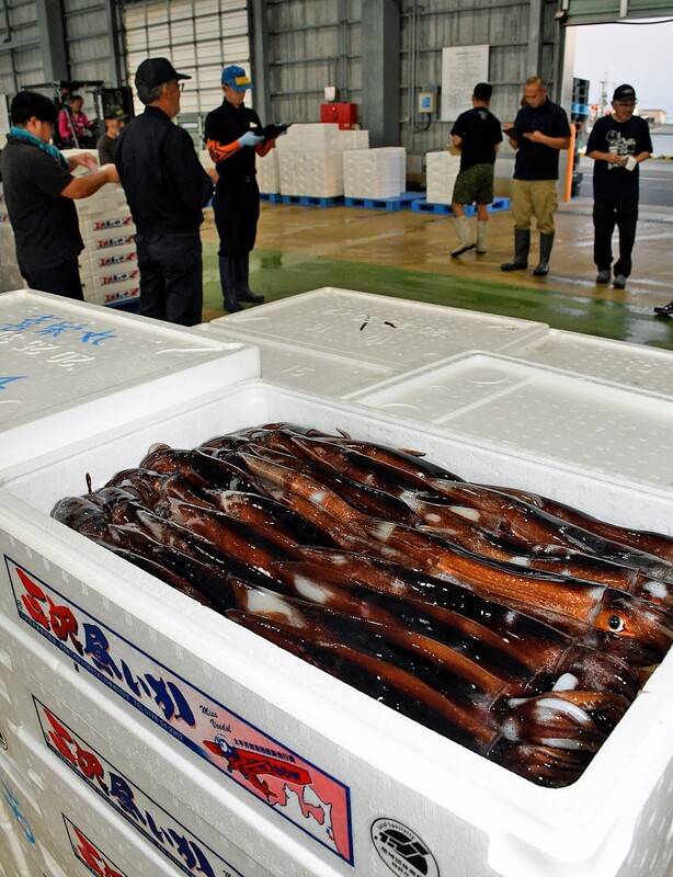 18日夕、三沢漁港にはイカ釣り漁船が次々に寄港して荷揚げ。入札会場には5キロ入りの発泡スチロール箱が約4千ケース並んだ。今期は1ケース平均3千円前後といい、仲買人の一人は「スーパーに並べば2匹で400円くらい。水揚げが増えて家庭でも買いやすくなった」と話した。