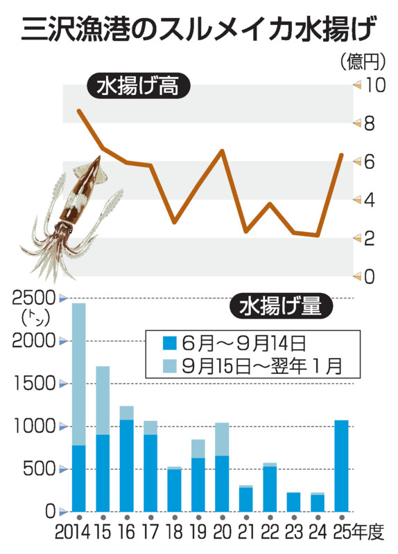 「三沢昼いか」として地域団体商標に登録されている三沢沖スルメイカの水揚げが好調だ。昨年度まで2年連続で過去最低が続いていたが、今期は今月中旬までに千トンを超え、ここ10年の年間最多水揚げ量に迫っている。関係者は「はっきりした原因は分からないが、今の水揚げが続いてほしい。良いサイズの出荷が続けばブランド力の強化につながる」と力を込める。