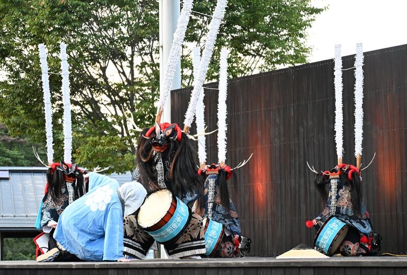 花巻北高放送部による童話「鹿踊りのはじまり」の朗読でスタート。 花巻農高鹿踊部は「かかし踊り」を披露し、大迫力の演技で会場を沸かせた。