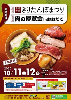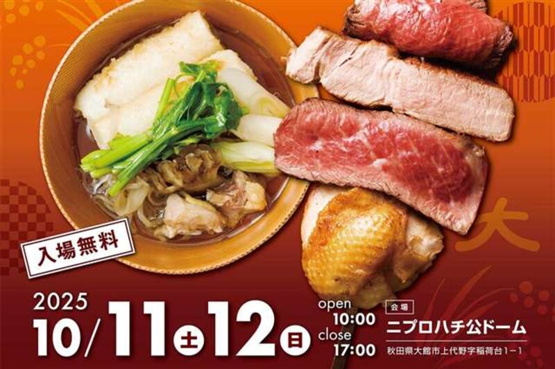 今回は、例年6月に大館市で開かれていた「肉の博覧会inおおだて(肉博)」と同時開催。屋外の「肉博エリア」に市内外の10店が出店する。購入した肉を自分で焼く「やぎにぐ村」や、比内地鶏の焼き鳥ブースなどが設けられる。肉博は10回目となる今回で終了する。
