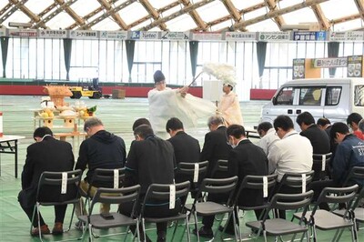 本場大館きりたんぽまつりの会場となる大館市のニプロハチ公ドームで7日、安全祈願祭が行われ、関係者がイベントの成功を祈った。