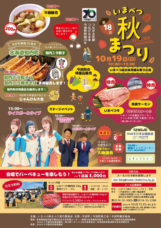 いまべつ牛の特売や完全予約制バーベキューなどが楽しめる恒例の「いまべつ秋まつり」は10月19日、いまべつ総合体育館お祭り広場で開催される。午前10時から午後3時まで。