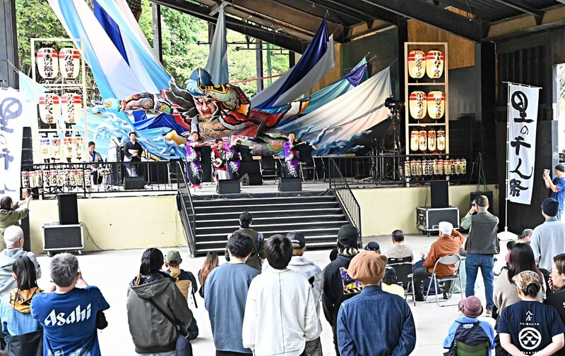 里の千人祭は、土地・建物を所有する「おおびらき温泉」(本社青森市)と実行委員会が主催。平内町出身の津軽三味線奏者高橋竹春さんの一座や、ねぶたばやしの団体、ラッパー、シンガー・ソングライター、ダンスユニット、和太鼓チームなどが、かつてのねぶた展示場のステージと芝生エリアに次々と登場し、多彩なステージを繰り広げた。