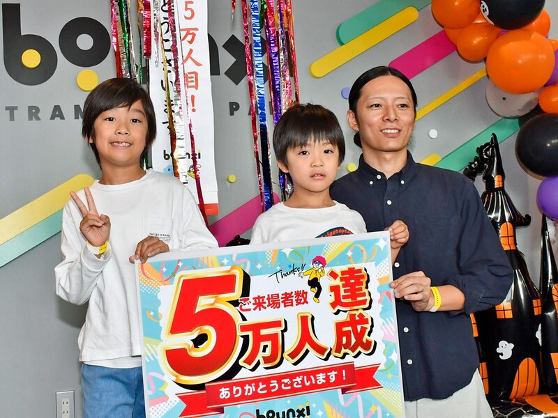 青森県八戸市の八戸駅西地区に昨年5月にオープンした「バウンシートランポリンパーク」(長根智弥店長)の来場者が13日、5万人を達成した。5万人目となった青森市の新谷葵(あお)さん(7)、陽(あき)ちゃん(6)兄弟に無料券20枚とオリジナルタオルが贈られた。