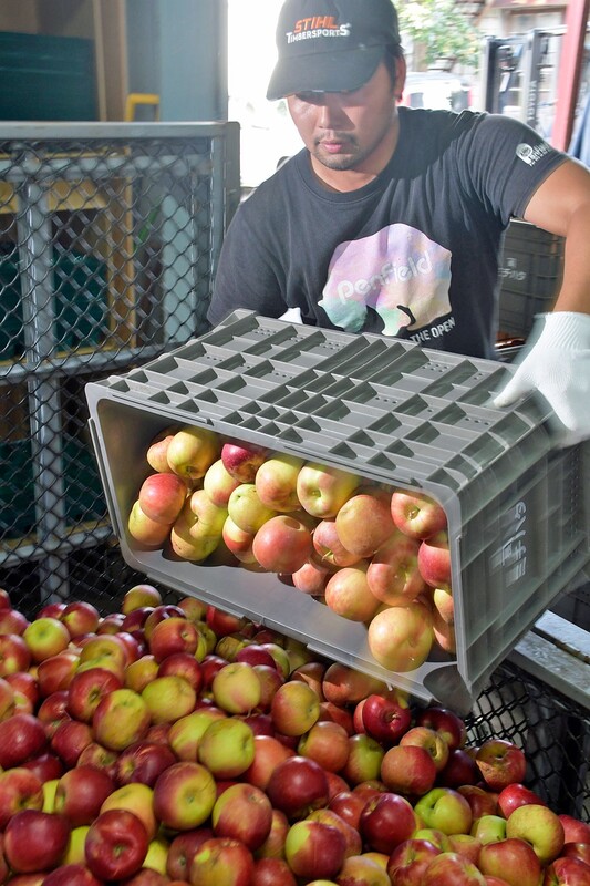 同組合から同ワイナリーへの出荷は9年目。加工用リンゴのため、果実全体を均一に色づける玉回し作業が不要で、葉を取らずに育てられ、人手不足や高齢化が進む農家の省力化にもつながっている。
