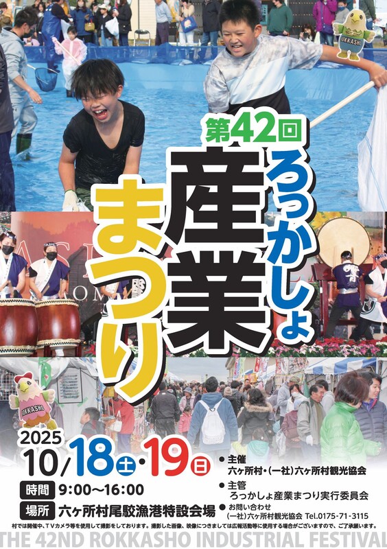 今週末は尾駮漁港特設会場にて、第42回ろっかしょ産業まつりが行われます。村の名産物を味わえる多くの屋台やヒラメなどの魚のつかみ取りができるお魚広場、VRのお化け屋敷など盛りだくさんです。皆さまのご来場をお待ちしております。