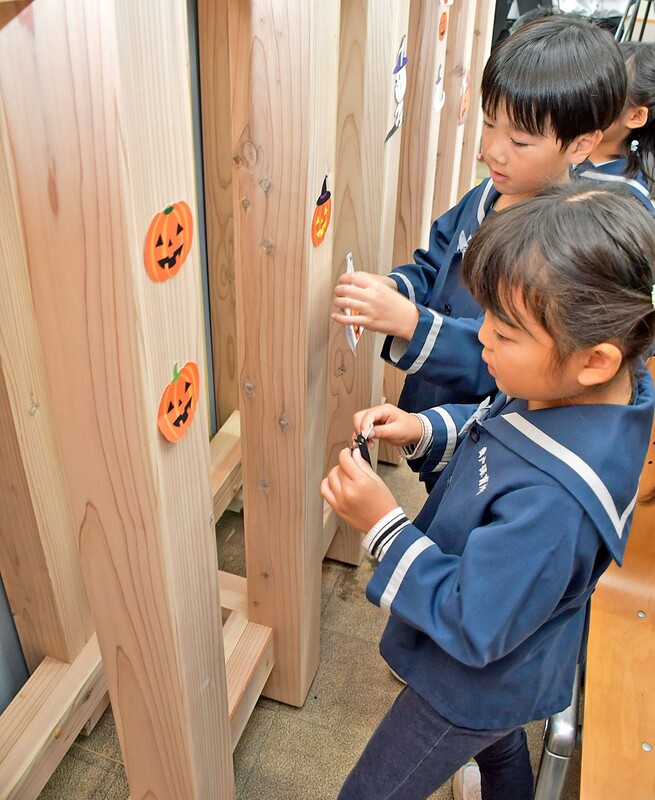 地元の舞戸子の星こども園の園児11人も駅を訪れ、ウッドゲートなどにハロウィーンの飾り付けをした。子どもたちには、青森ヒバの箸と駅の内装に使ったものと同じスギ材から作ったコースターがプレゼントされた。