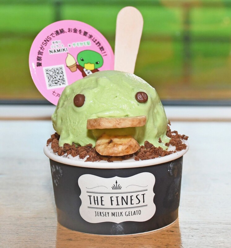 青森県七戸町のジェラート専門店「手作りジェラートNAMIKI」は16日から30日まで、県警の特殊詐欺被害防止キャラクター「サギかもくん」を模した特製ジェラートを店内で販売している。特殊詐欺の被害が全国的に深刻な状況を受け、関係者は「甘い話には気をつけて」と啓発に取り組んでいる。