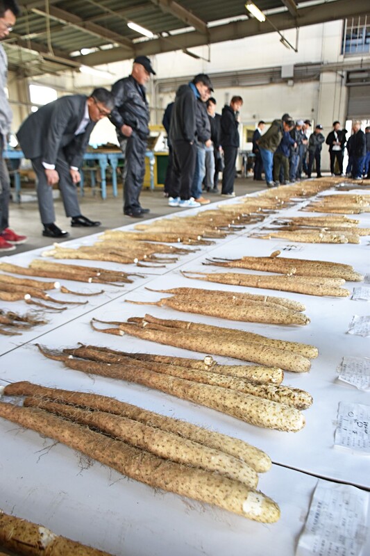 同農協管内の生産者、県内外の取引事業者など約130人が出席。作柄調査では、生産者58戸が試験用に収穫したナガイモ174本が並び、来場者はそれぞれの品種系統や使われた肥料などを確認しながら、ナガイモの重さや固さ、形状を吟味していた。