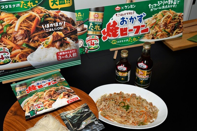 ビーフン製造販売大手のケンミン食品(神戸市)は9月1日から、上北農産加工(青森県十和田市)の「スタミナ源たれ」とコラボした新商品「おかず焼ビーフン スタミナ源たれ味」を販売している。23日、両社の関係者が県庁を訪れ、宮下宗一郎知事に「新しい県民食にしたい」とPRした。