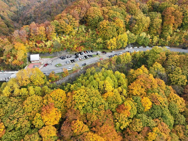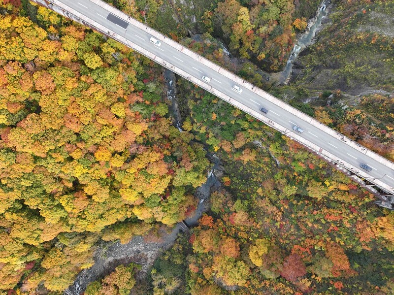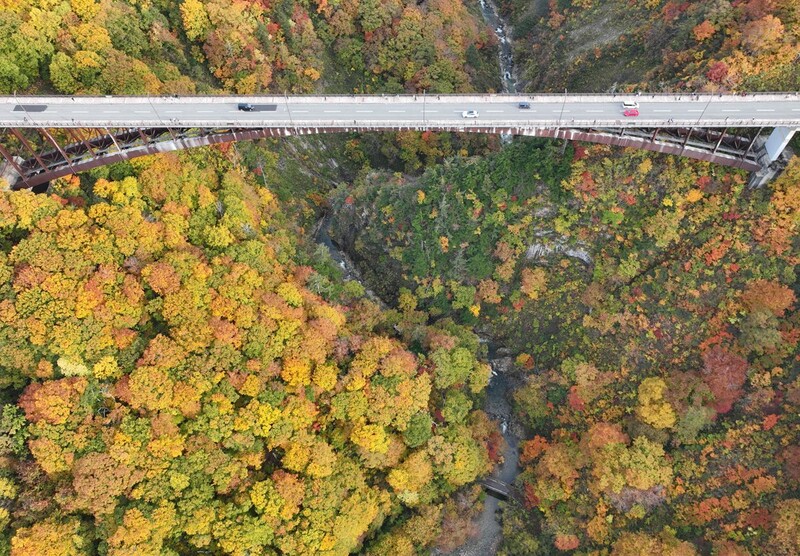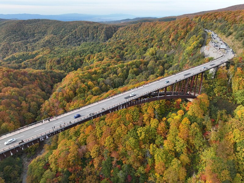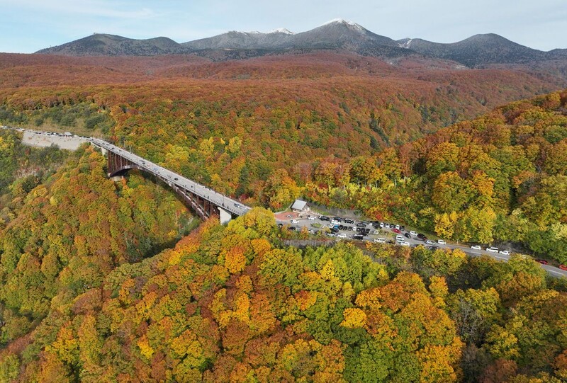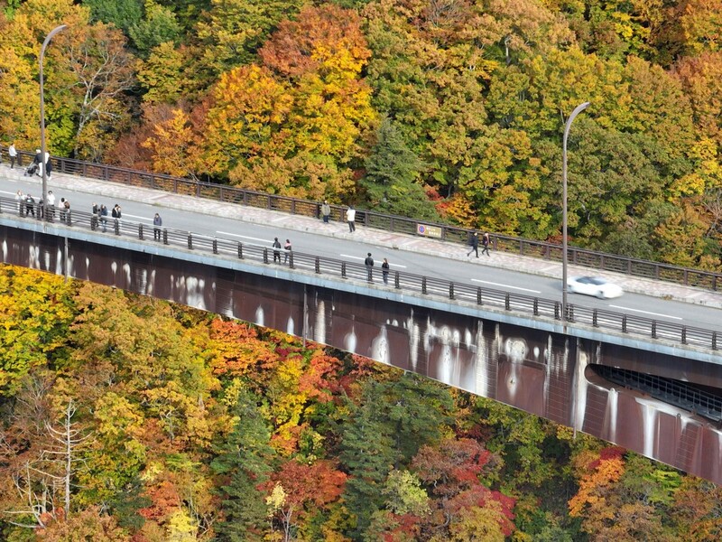 弘前市から訪れた弘前大学大学院2年の太田空良さん(24)は「(大きな橋のような)人工物と紅葉の共演はなかなか見られるものではない」と話した。