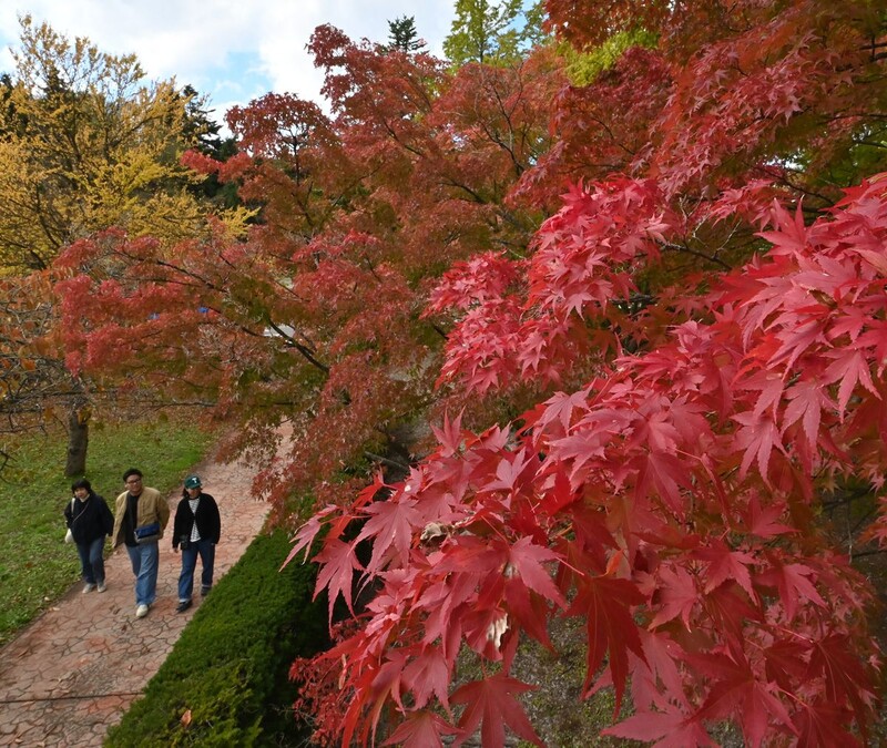 青森県平川市の猿賀公園で、秋の深まりとともに木々の葉が色づき始めている。27日は午前中、雲の合間から秋の日差しが注ぎ、訪れた行楽客は赤や黄色の葉に目をやりながら園内をのんびり散策した。