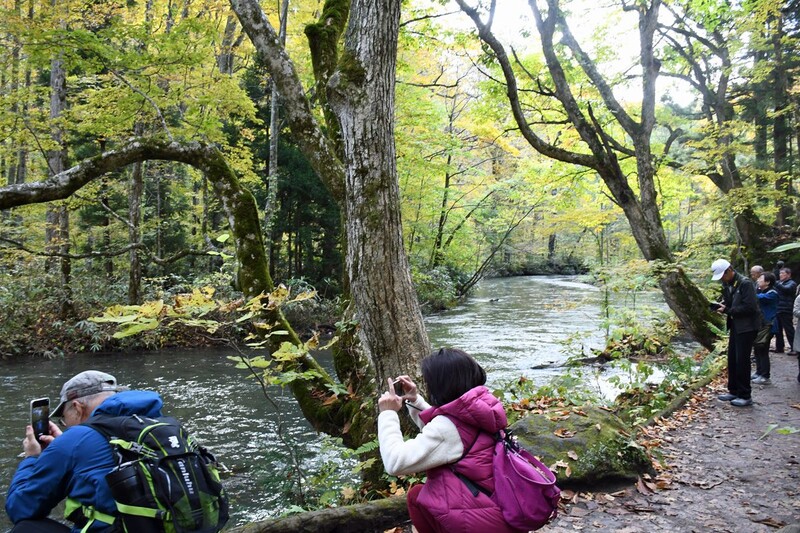 木々が色づき始めた奥入瀬渓流(青森県十和田市)沿いの国道102号で27日、今年のマイカー規制が始まった。観光客はマイカー用の駐車場がある同市焼山地区と休屋地区を結ぶシャトルバスなどを活用。遊歩道をゆったりと歩き、渓流のせせらぎに耳を澄ませた。規制は11月2日まで。