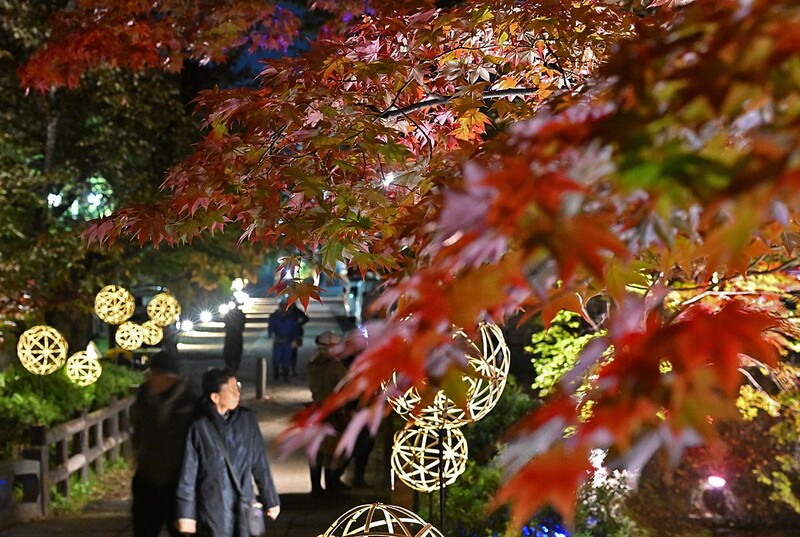 青森県弘前市の弘前公園で29日夜、31日の弘前城菊と紅葉まつり開幕を前に、夜の桜とモミジを照らす特別ライトアップの試験点灯が行われた。明かりを受けた木々の葉は、昼間とひと味違う鮮やかさを見せ、周囲を幻想的に彩った。