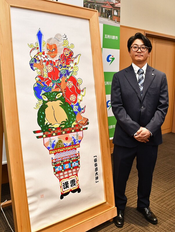 市役所で鶴谷さんと佐々木孝昌市長が下絵をお披露目した。猿田彦大神は日本神話で、ニニギノミコトが天孫降臨した際に道案内をした神。下絵には、鼻の長い猿田彦が鮮やかな赤の着物に身を包み、道の先を指さす様子が描かれている。足元には、猿田彦の使いであるカエルがどっしりと座り、存在感を放っている。