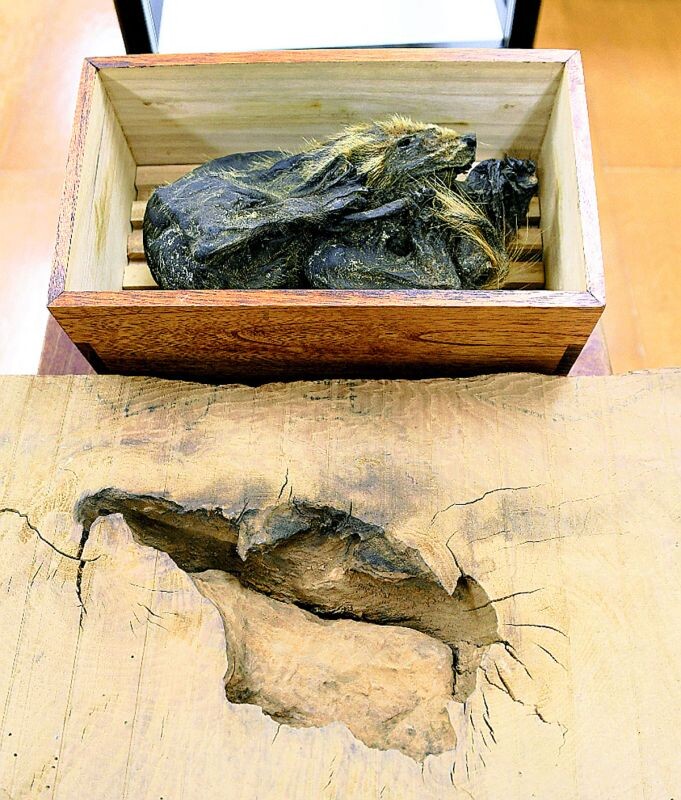 子グマは体長約40センチで体が二つに折れ曲がっており、顔立ちや足の爪がはっきりとわかる。顔や尻尾には毛が残っており、年月を経てもなお状態の良さがうかがえる。子グマが入っていた穴が開いた板も展示している。