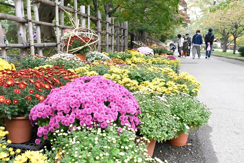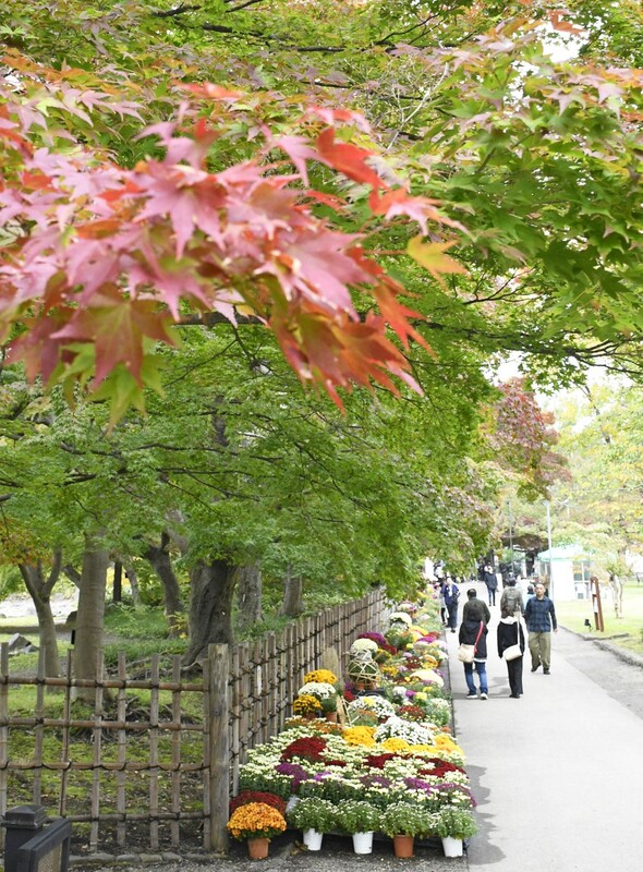 弘前城菊と紅葉まつり(まつり運営委員会主催)が31日、青森県弘前市の弘前公園・弘前城植物園を主会場に開幕した。紅葉したカエデや桜が見ごろを迎えており、園内には市民が育てた菊や巨大フラワーアートなどを展示。来園者の目を楽しませている。11月9日まで。