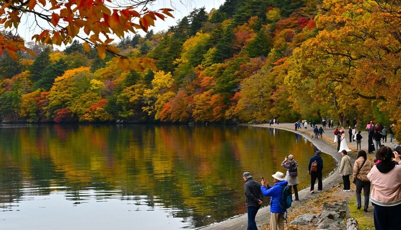 十和田湖畔の紅葉が見ごろを迎えている。31日は多くの観光客らが湖面近くに広がる錦秋の景色を楽しんでいた。