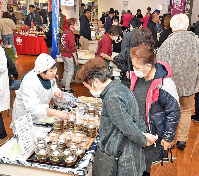 会場の3階催事場では、弘前市の清水森ナンバを使った「おむすび」、深浦町の「紅鮭(べにざけ)すし」などのフェア初登場品や、毎回人気の鯵ケ沢町の「ケーキ・ド・大福」など多くのブースがにぎわった。五所川原市の「十三湖しじみのすくいどり」は、くじ引きで大きなスコップを使う権利が当たると高らかに鐘が鳴らされ、参加者は周囲の注目を集めながら大量にすくって大喜び。各市町村は試食を提供したり、ステージ上でのPRタイムでは、じゃんけん大会、ゆるキャラ出演などで名産品をPRした。