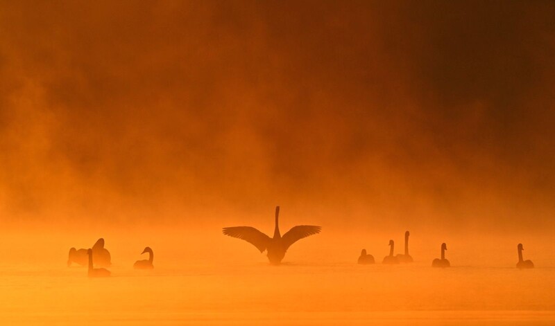 4日早朝、ハクチョウの飛来地として知られる青森県平内町の浅所海岸で、海面から霧が立ち上る現象・気嵐(けあらし)が見られた。湯気のようにもうもうと霧が立ち込め、朝日を浴びてオレンジ色に染まった。
