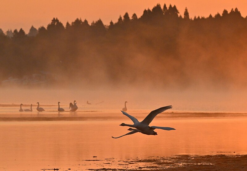 午前6時過ぎの同海岸ではハクチョウ約20羽が羽休め。やがて朝日が昇ると、逆光の中で美しいシルエットをつくった。