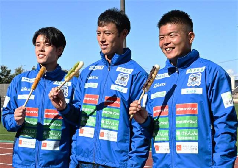 24日にきりたんぽの試食会が秋田市のソユースタジアムで開かれ、選手らは「おいしい」「見栄えがいい」などと感想を述べながら味わっていた。中村選手は「きりたんぽの香ばしさとあずきの甘さがマッチしていてすばらしい」と話した。