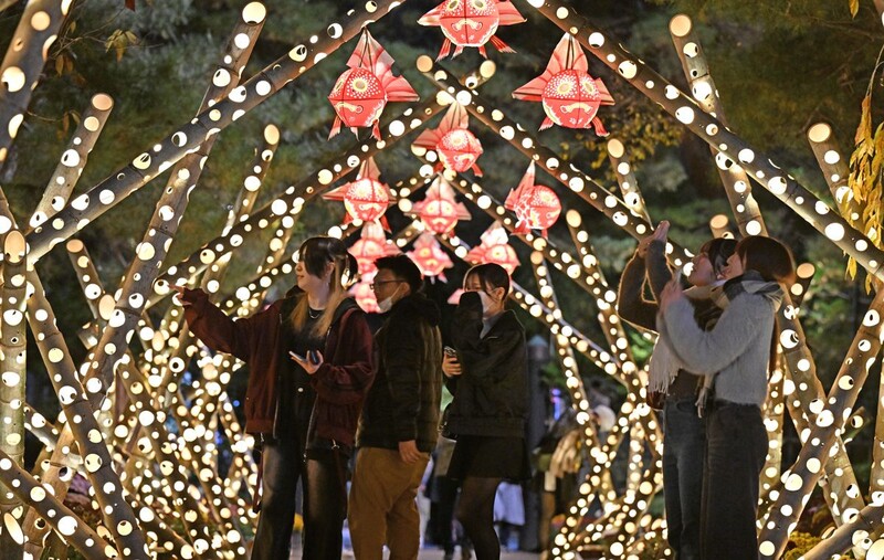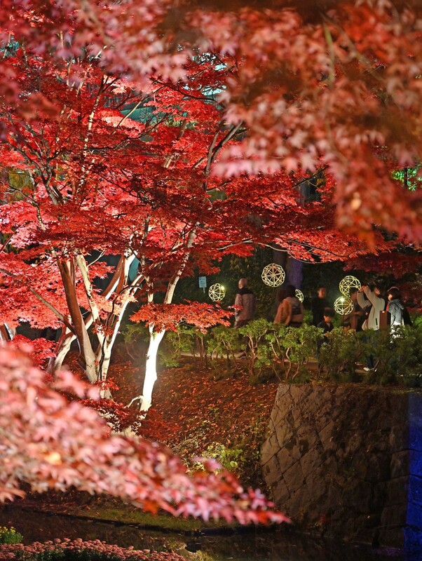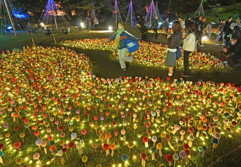 主会場・弘前城植物園では、72種類の鮮やかな造花で作られた巨大フラワーアート「綾山玄武(りょうざんげんぶ)」が出迎え、来園者の目を楽しませる。日没後には、カエデや桜のライトアップに加え、綾山玄武へのプロジェクションマッピング、竹で作ったオブジェ「竹あかり」のアーチや、毛糸で作った丸い菊を敷き詰めた「ぽんぽんマムの庭」などが幻想的な雰囲気をつくり出している。まつりは9日まで。