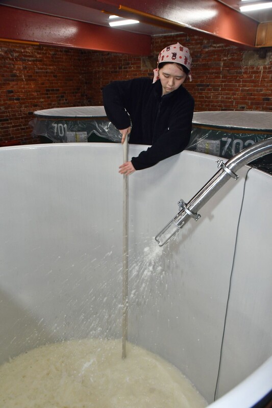 11日は、作業の一部が報道陣に公開された。県産酒米「華吹雪」を大きな甑(こしき)で蒸し上げた後、機械を使って酒米と水をホースで一緒にタンクへ送り込んだ。長い棒でもろみをかき混ぜる「櫂(かい)入れ」も行った。