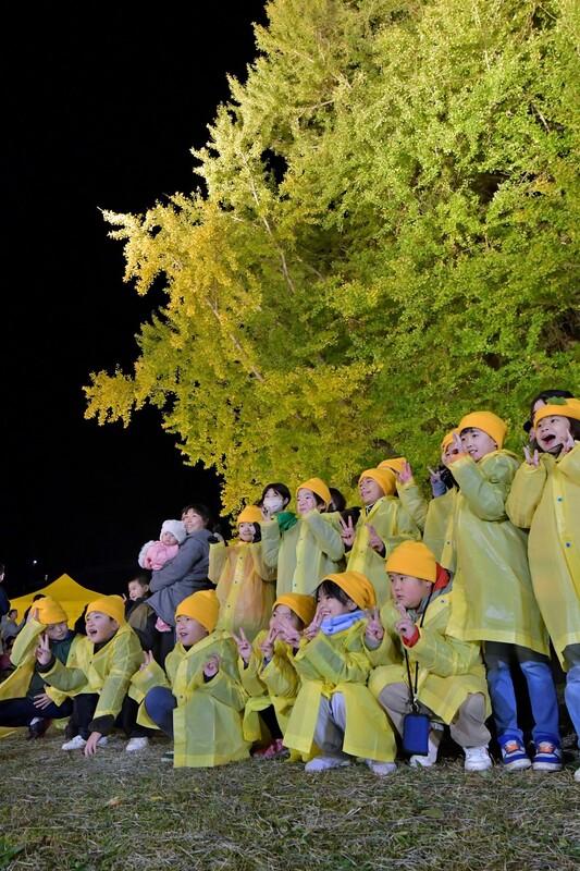 午後6時過ぎに始まった点灯式では、平沢一臣町長が「地域の誇りである樹齢千年の荘厳な大イチョウがまばゆい黄金色に照らし出される。幻想的な美しさを皆さんと楽しみながら、今年1年の歩みをゆっくりと振り返る時間にしたい」とあいさつした。続いて、おそろいの黄色の帽子とレインコートに身を包んだ地元・修道小学校の児童16人が、カウントダウン後にスイッチを押して点灯させバンザイ。「ビッグイエロー(北金ケ沢のイチョウの愛称)」のかけ声とともにピースサインで記念写真に納まった。