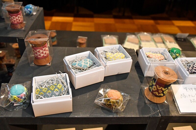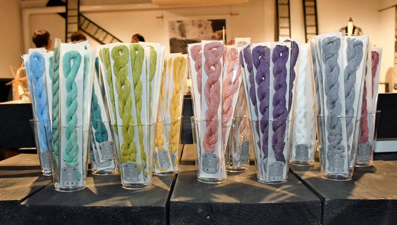こぎん刺しに使われる一般的な綿の糸のほか、同店が創業以来販売している絹糸も提案する。「つやがある絹糸もこぎんに使ってもらえたら幅が広がるのではないか」と新たな可能性が広がることに期待をかけている。京都らしい和を感じる柔らかいカラーのほか、地元特産のトウモロコシ・嶽(だけ)きみの皮とリンゴの木を使って染めた糸もあり、青森県らしさを楽しむことができるよう工夫した。