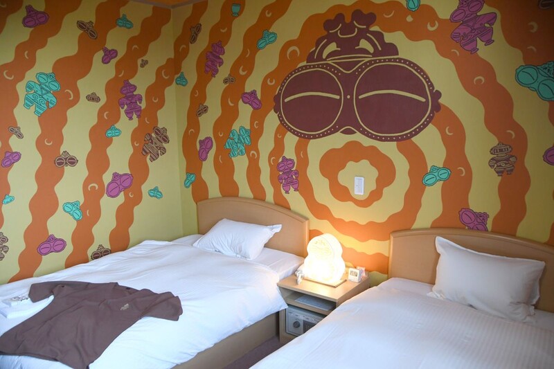 今回、新館のツインルーム1室を改装し、青森市のイラストレーター・デザイナーの豊川茅さんがデザインを担当。壁一面に遮光器土偶のイラストや出土品などが描かれ、土色のイメージを覆すポップな仕上がりになっている。また、灯籠などの小物類にもこだわった。夕食は古代米などを使った特別メニューを提供する。