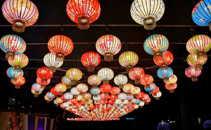 18日の点灯開始後、初の週末を迎えた21日夜は断続的に市民らが訪れ、色鮮やかな提灯を写真に収めたり、温かい飲み物やグルメを味わったりしていた。
