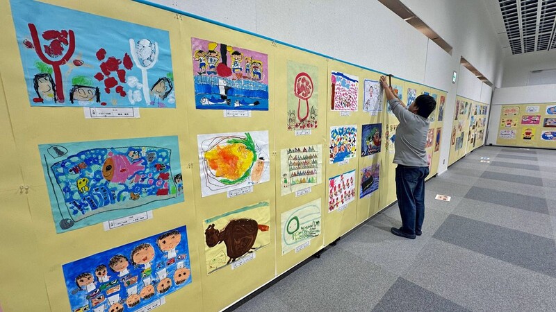 今年の同展には、県内の幼稚園・保育園児や小・中学生から計4198点(図画3663点、版画535点)の応募があった。27日は展示スタッフらが丁寧に作品を張り付け、照明の具合を確認するなど、開幕に向けた準備を行っていた。