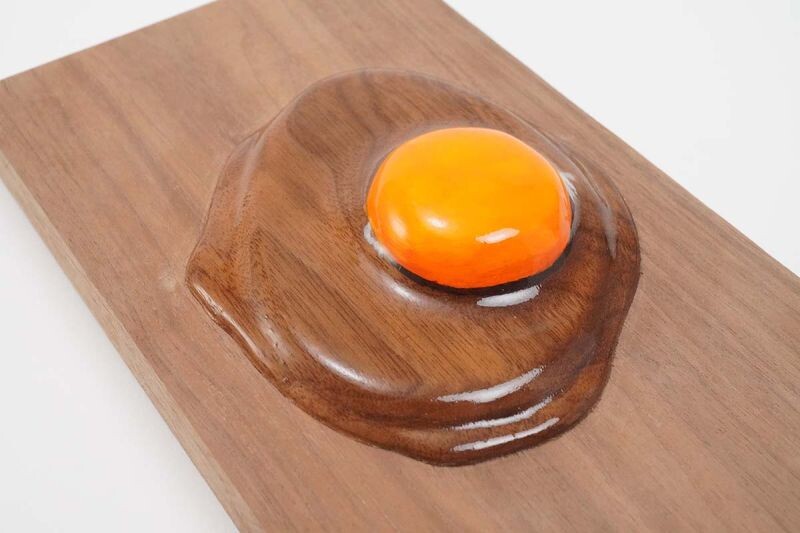 会場では本物の食べ物そっくりの木彫り作品約100点を展示。「生卵」は、まるで殻を割ってまな板に落とした直後のよう。黄身も白身もつやつやと光沢を放っている。