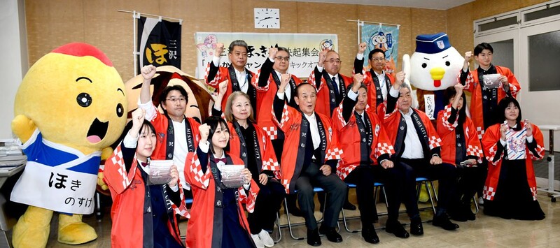 青森県三沢沖などで水揚げされる冬の味覚ホッキガイを使ったご当地グルメ「三沢ほっき丼」をPRする恒例のキャンペーンが、12月3日から来年3月末まで市内の22店で行われる。26日に市役所で決起集会が開かれ、関係者が気勢を上げた。