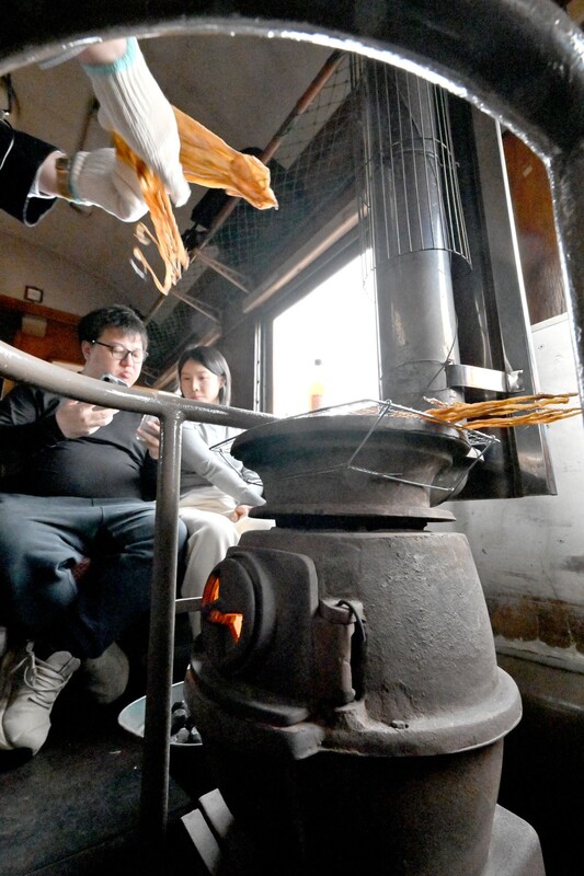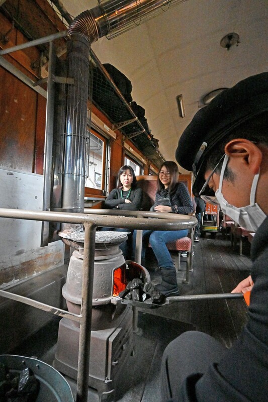 一番列車の乗客約50人は津軽五所川原駅で津軽三味線の演奏に見送られ出発。昭和20年代に製造された車両には、1両に2台ずつストーブが置かれ、車掌が石炭をくべると客車にぬくもりが広がった。乗客らは、ストーブであぶってもらった名物のするめや県産の日本酒を味わい、津軽の冬の旅情を満喫していた。