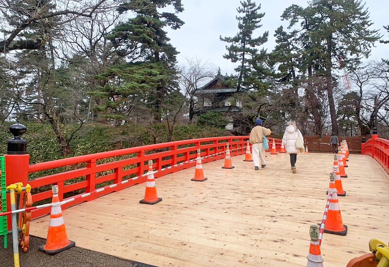 改修工事のため8月から通行止めとなっていた弘前公園(青森県弘前市)の「杉の大橋」の工事が終わり3日、歩いて渡れるようになった。通行止め期間中は追手門から天守のある本丸に向かう際、遠回りする必要があったが、開通で本丸へのアクセスが良くなった。