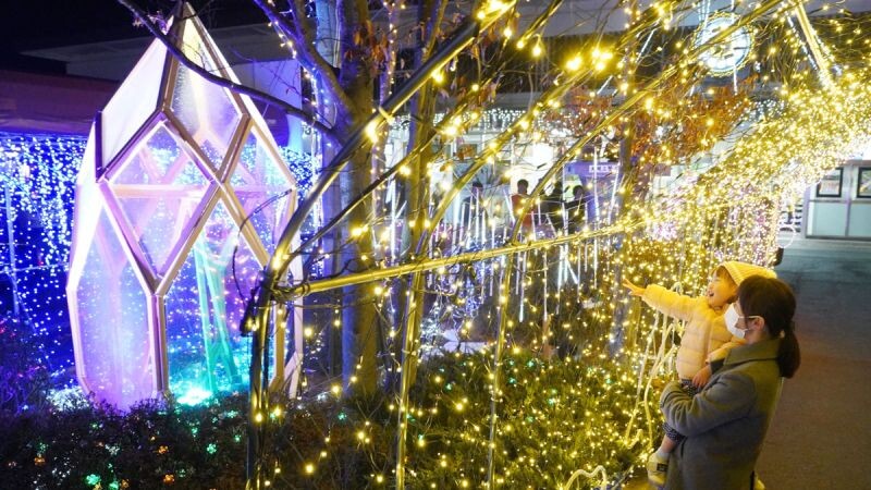 現地で1日に点灯式を実施。関係者がボタンを押すと青やピンクなどの電飾が一斉に点灯し、集まった親子連れらが「うわあ」「きれい」と目を見張った。