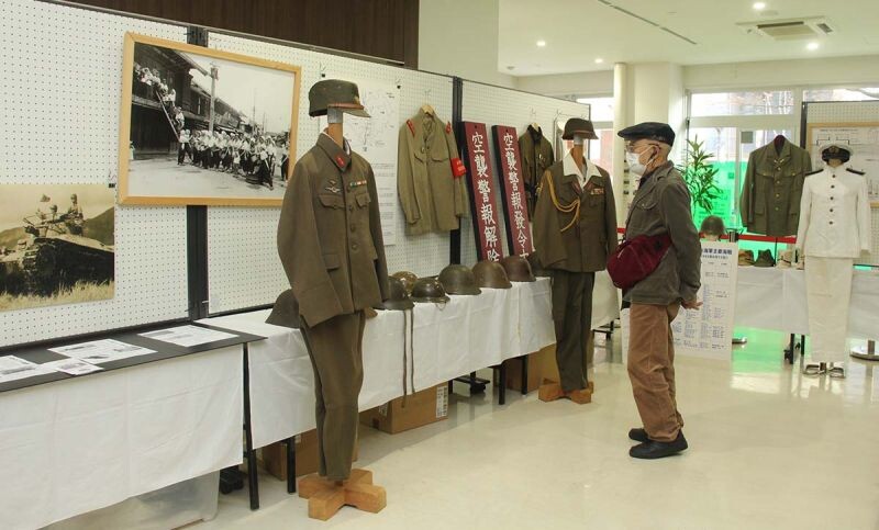 企画展名は「第二次世界大戦終結八十年~戦火に生きた人々へ、鎮魂を~」。旧帝国陸海軍の軍服のほか、飯ごうや水筒などを展示した。日本だけでなく、世界が戦場になっていたことを伝えるため、米軍の軍服や約10カ国のヘルメットなども並べた。
