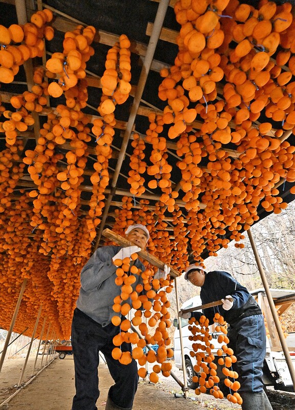 同町鳥舌内地区にある大向光嘉さん(78)方では、11月下旬から妙丹柿を使った干し柿作りが始まった。この日作業場では地区住民15人が、皮むきや柿をひもにくくりつける作業に追われた。長さ50メートル以上ある専用の干し場では、今年用意した約18万個の柿を干し終えた。大向さんは「夏の暑さを心配したが、今年はいい柿ができた。最近は暖冬傾向なので、厳しい寒さに期待したい」と話した。