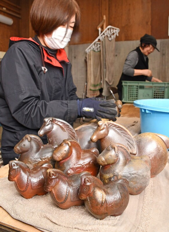 今回は大、中、小のウマの置物のほか、愛らしいウマが両手を合わせる「うまたん」、猫がウマのかぶり物をしている作品など計約500点を制作。「五連登り窯」で5日間ほど焼き上げた後、窯の温度が下がるのを待って、この日取り出した。