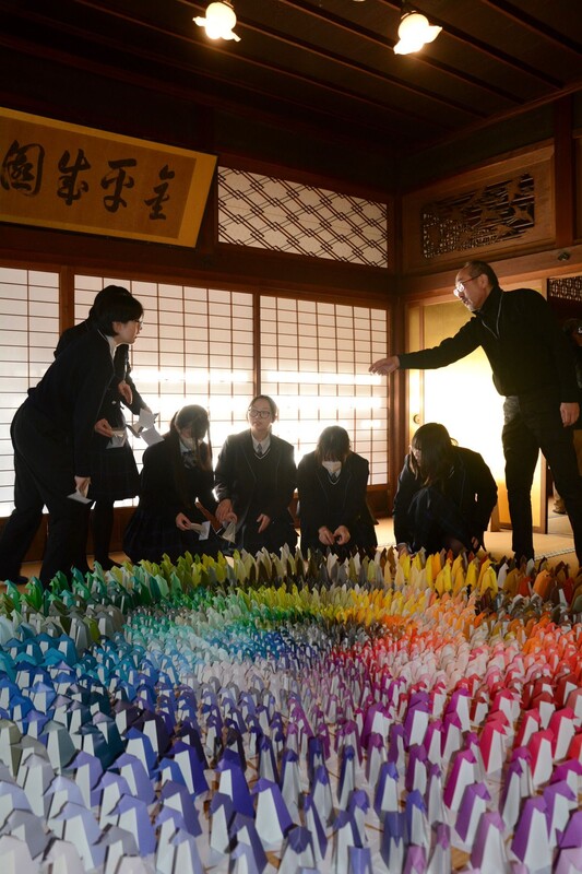 10日に折り紙を並べる作業をしていた3年生の澁谷陽南詩(ひなた)さんは「全学年で折って一体感を感じたし、並べてみると想像以上の出来。黒石高校を目指す中学生や地域の多くの人たちに見に来てほしい」と話していた。