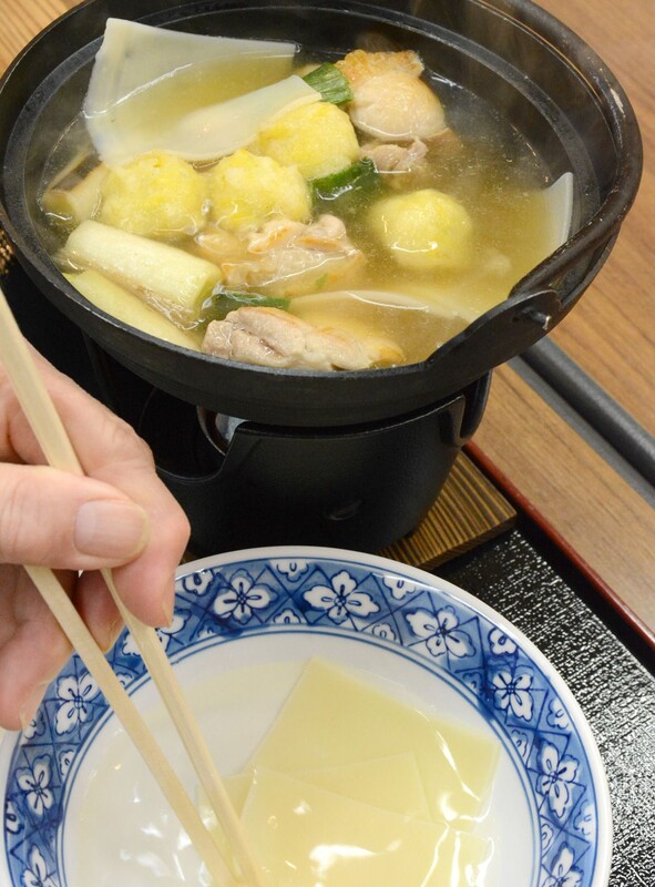 「南部太ねぎは甘みがあって、鶏肉はあべどり、菊ボールは阿房宮で丸く揚げたもの。沸騰して菊ボールを入れるときれいな黄色になって、食感はシャキシャキ、香りもいいんですよ」