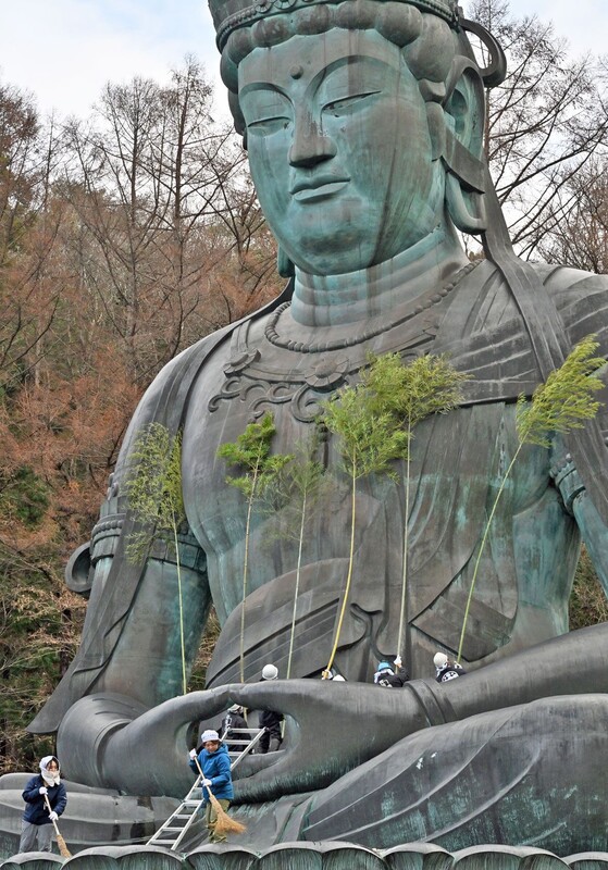 高さ約21メートルの大仏が鎮座する「蓮台(れんだい)」の上で、職員や宮大工らが約4メートルのササ竹やほうきを手に作業した。職員らは足元に気をつけながらさらに大仏の手のひらに上り、胴体についた汚れやほこりをササ竹で丁寧に「お身拭(みぬぐ)い」した。