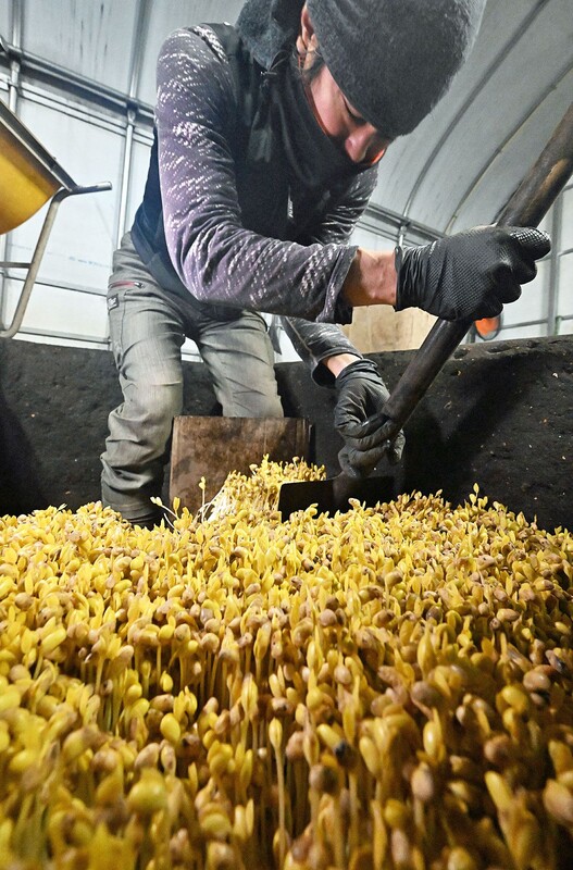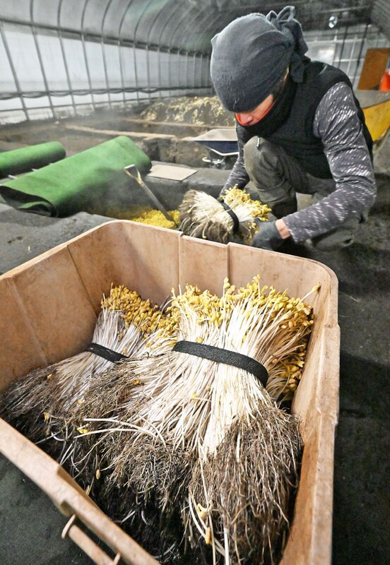 青森県大鰐町の伝統的な地域の味覚「大鰐温泉もやし」の収穫が本格化し、生産者は連日収穫作業に追われている。15日も朝から、温泉の熱で育てたもやしを丁寧に引き抜き、出荷用の束に仕立てる姿が見られた。