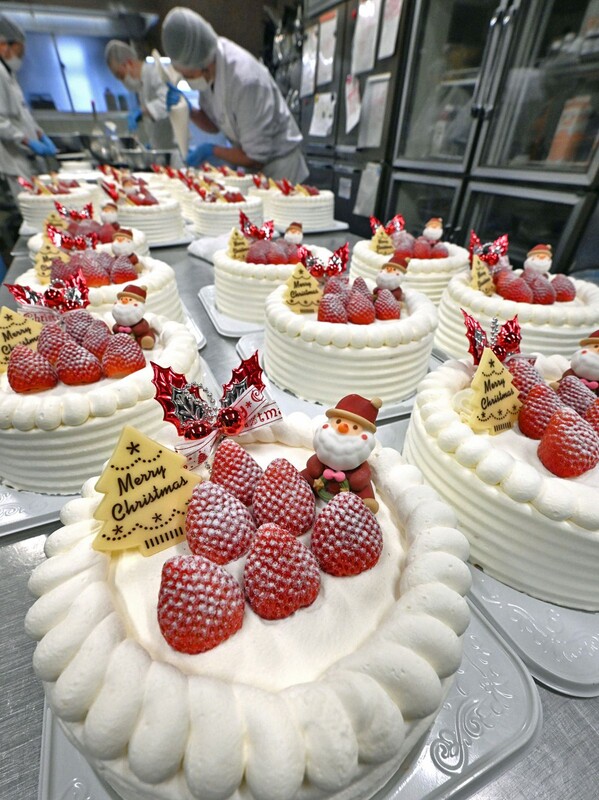 青森市の「ウィーン菓子シュトラウス」の工場では、スタッフ12人が作業に大わらわ。イチゴと生クリームを重ねた定番の白いケーキを中心に、こくのあるオレンジのクリームが自慢のブッシュドノエル、チーズタルトといった売れ筋を次々と仕上げていった。21~24日に計約500~600個作る。