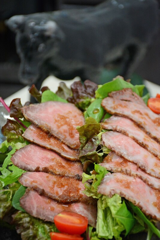 撮影用に盛り付けをお願いしたのは陸マグロのローストビーフ。「うちは(うま味成分の)オレイン酸を追求した自家配合の飼料にこだわっていて、モモ肉にもサシが多く入っているのが特長です。津軽海峡の潮風でミネラル分をたっぷり含んだ牧草地で約30カ月、愛情込めて育てています」